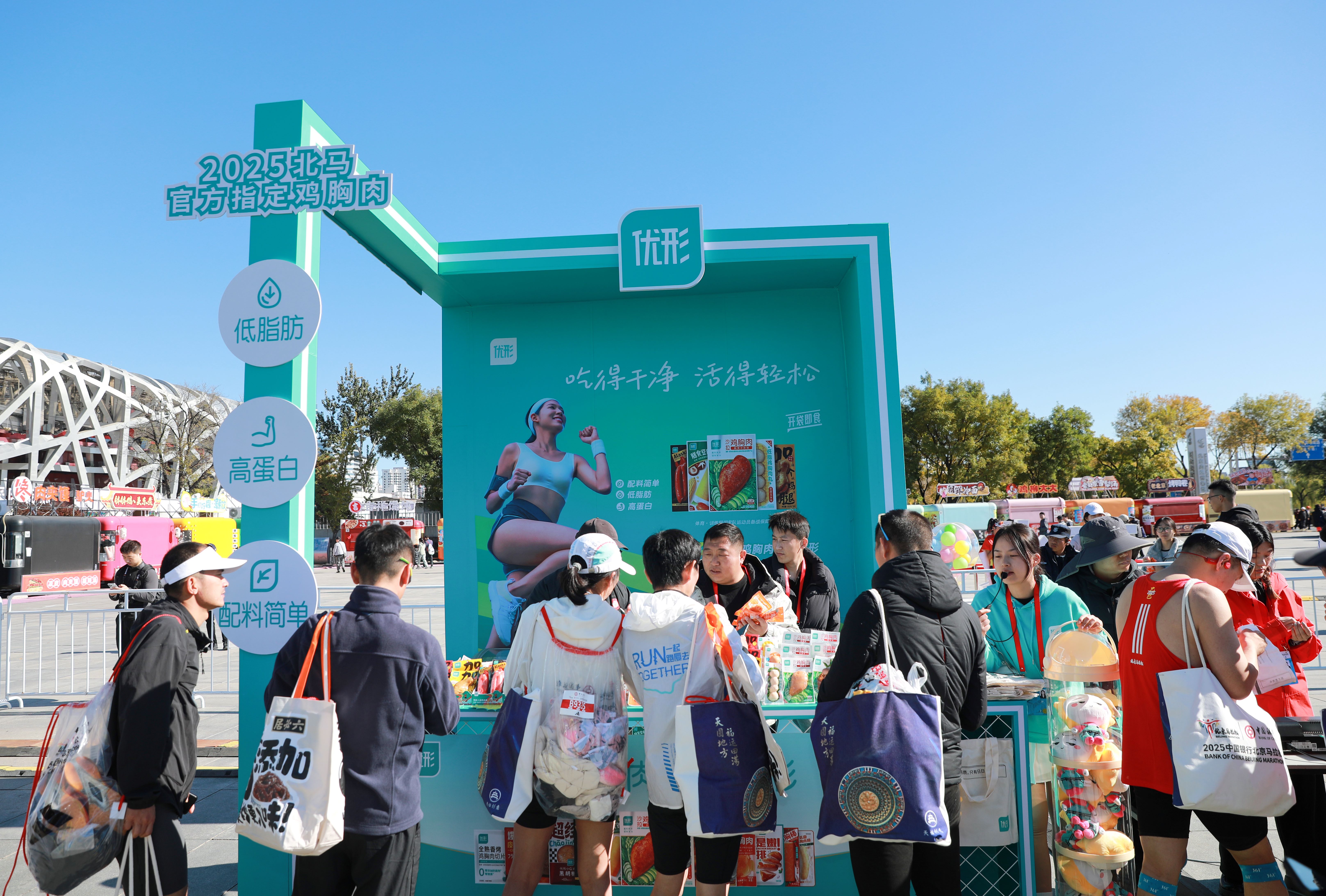 在国家体育场(鸟巢)庆典广场,优形展位俨然成为北马终点区的人气焦点。现场陈列的沙拉鸡胸肉、低脂鸡胸肉丸、小Q鸡胸肉等20多款优形全系列产品,以试吃福利吸引跑者排起长队,每一口鲜嫩滋味都堪称赛后恢复的慰藉。优形还悉心提供免费的号码布塑封服务,守护每一份完赛荣耀。